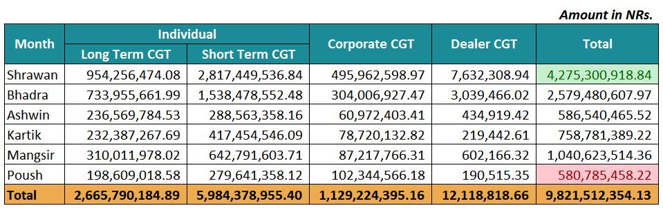 During the last six months, a total of Rs 9.82 billion in capital gain tax has been collected. Such collected reached the highest point in the month of Shrawan. In the month, capital gain tax of Rs 4.27 billion was collected followed by Rs 2.57 billion in Bhadra and Rs 1.04 billion in Mangsir. In the month of Ashoj, capital gain tax of Rs 586.5 million was collected and Rs 750 million in the month of Kartik.