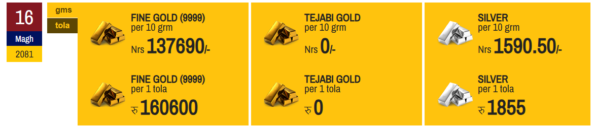 According to the Federation of Nepal Gold and Silver Dealers’ Association, the price of fine gold is Rs 160,600 per tola today.