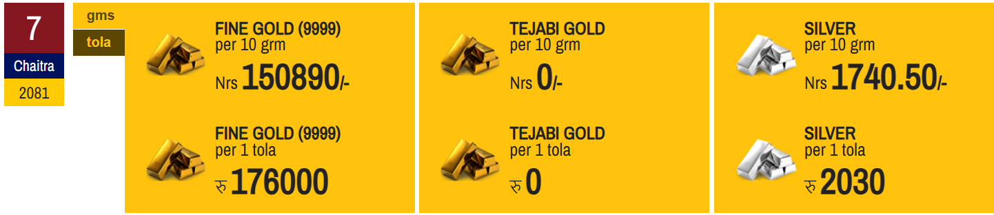 According to the Federation of Nepal Gold and Silver Dealers’ Association, the price of fine gold is Rs 176,000 per tola on the day.