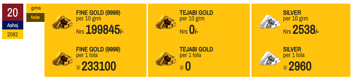 According to the Federation of Nepal Gold and Silver Dealers' Association, the price of hallmark gold has been set at Rs 233,100 per tola today.
