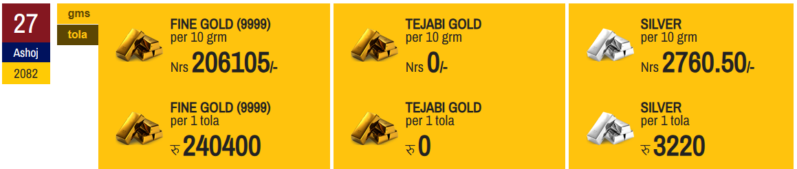 According to the Federation of Nepal Gold and Silver Dealers' Association, the price of hallmark gold has been set at Rs 240,400 per tola today.