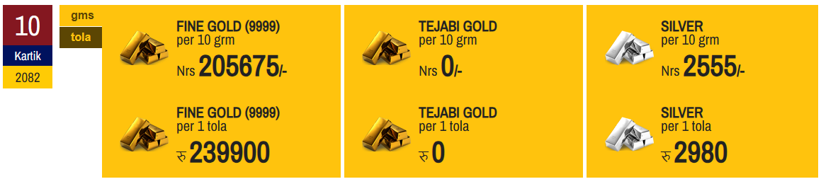 According to the Federation of Nepal Gold and Silver Dealers' Association, the price of fine gold has been set at Rs 239,900 per tola today.