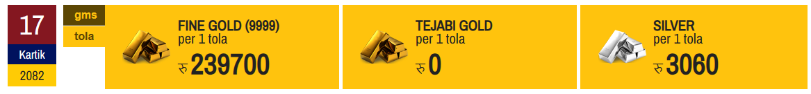 According to the Federation of Nepal Gold and Silver Dealers' Association, the price of fine gold has been set at Rs 239,700 per tola today.