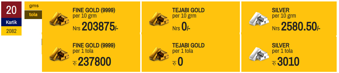 According to the Federation of Nepal Gold and Silver Dealers' Association, the price of fine gold has been set at Rs 237,800 per tola today.