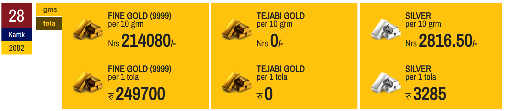 According to the Federation of Nepal Gold and Silver Dealers' Association, the price of fine gold has been set at Rs 249,700 per tola today.