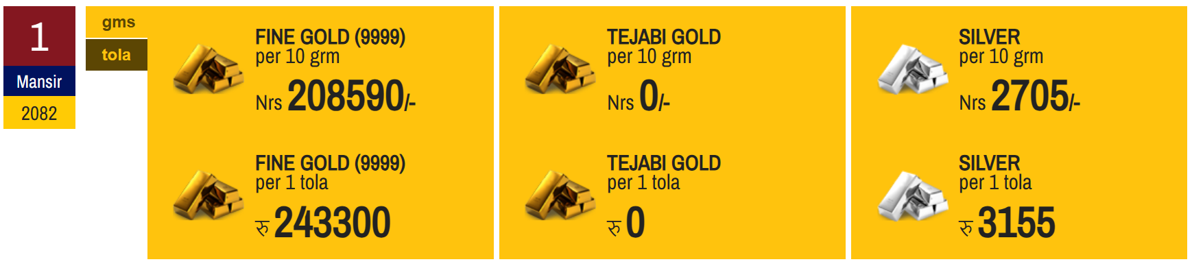 According to the Federation of Nepal Gold and Silver Dealers' Association, the price of fine gold has been set at Rs 243,300 per tola today.