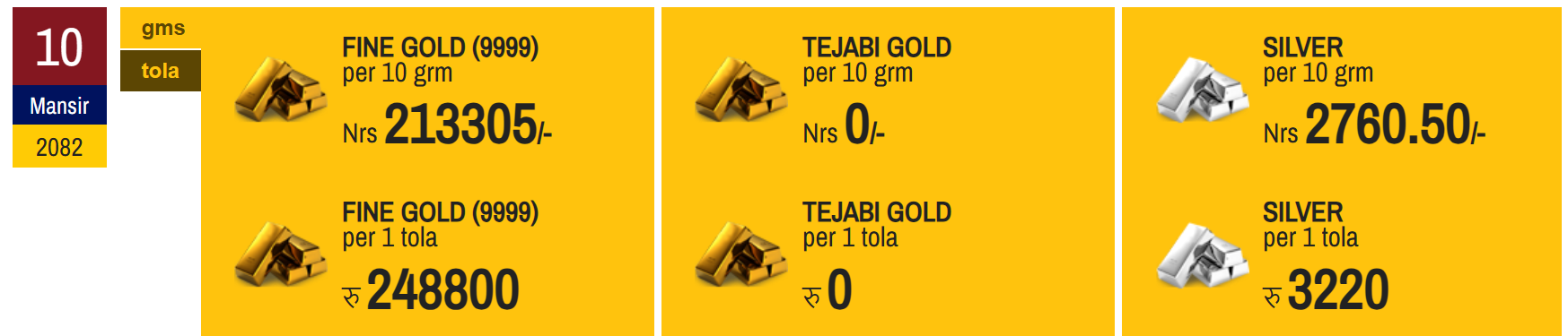 According to the Federation of Nepal Gold and Silver Dealers' Association, the price of fine gold has been set at Rs 248,800 per tola today.
