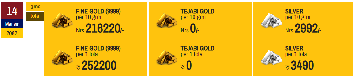According to the Federation of Nepal Gold and Silver Dealers' Association, the price of fine gold has been set at Rs 252,200 per tola today.