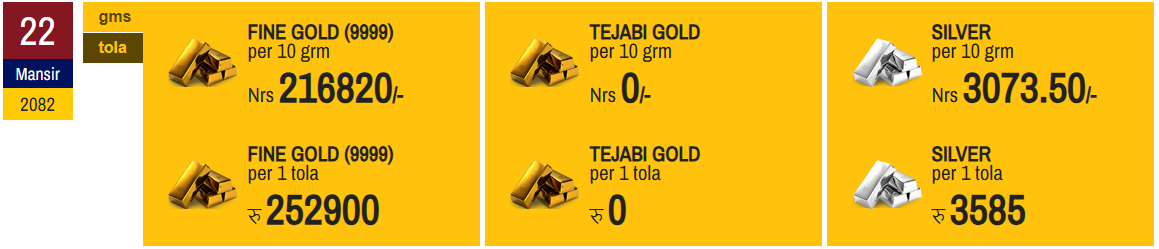 According to the Federation of Nepal Gold and Silver Dealers' Association, the price of fine gold has been set at Rs 252,900 per tola today.