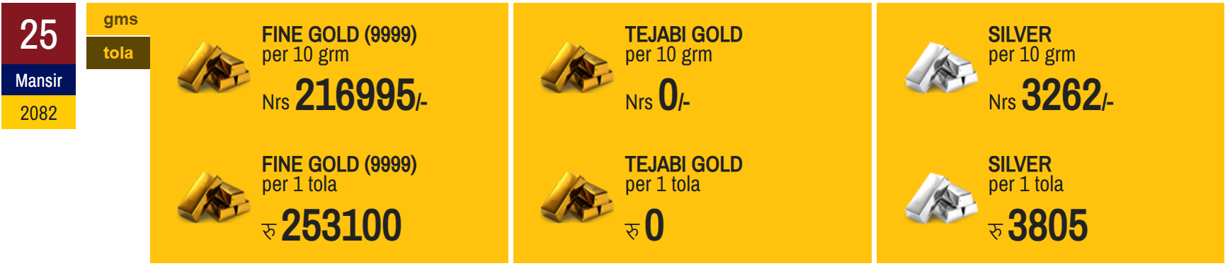 According to the Federation of Nepal Gold and Silver Dealers' Association, the price of fine gold has been set at Rs 253,100 per tola today.