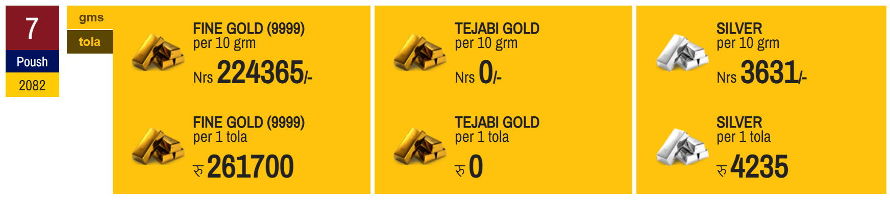 According to the Federation of Nepal Gold and Silver Dealers' Association, the price of fine gold has been set at Rs 261,700 per tola today.