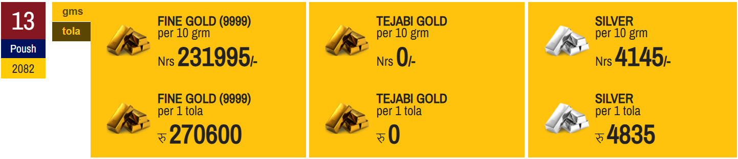 According to the Federation of Nepal Gold and Silver Dealers' Association, the price of fine gold has been set at Rs 270,600 per tola today.