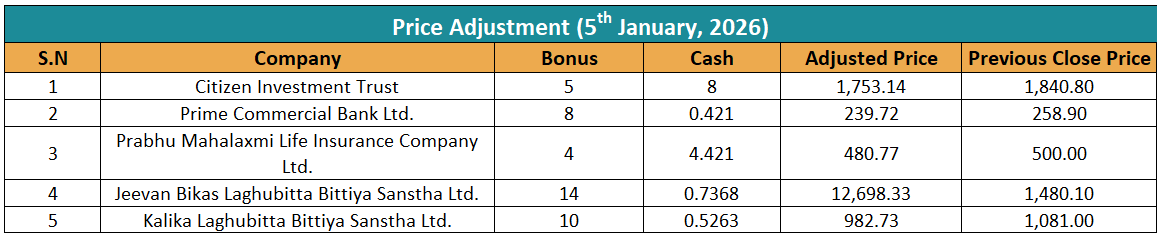 Nepal stock exchange has adjusted the stock price of five companies including of Citizens Investment Trust, Prime Commercial Bank, Prabhu Mahalaxmi Life Insurance, Jeevan Bikas Laghubitta and Kalika Laghubitta.