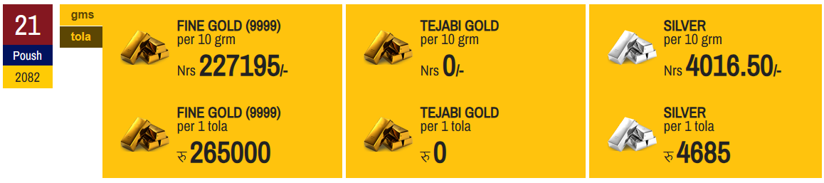 According to the Federation of Nepal Gold and Silver Dealers' Association, the price of fine gold has been set at Rs 265,000 per tola today.