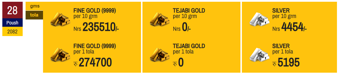 According to the Federation of Nepal Gold and Silver Dealers' Association, the price of fine gold has been set at Rs 274,700 per tola today.