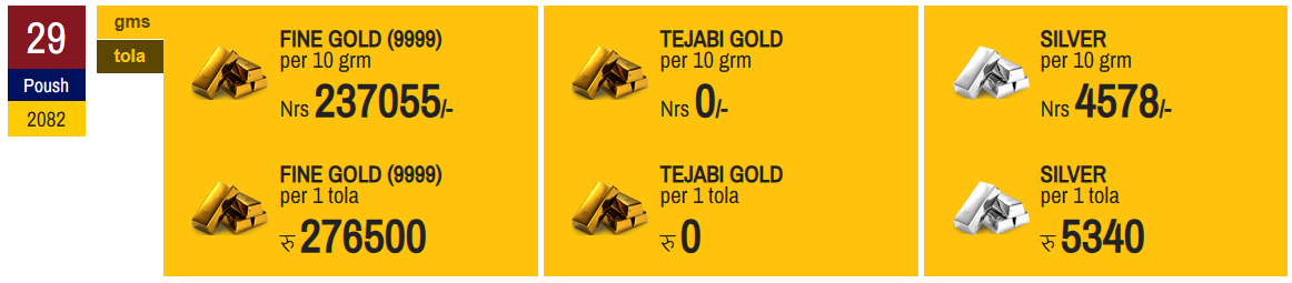 According to the Federation of Nepal Gold and Silver Dealers' Association, the price of fine gold has been set at Rs 276,500 per tola today.