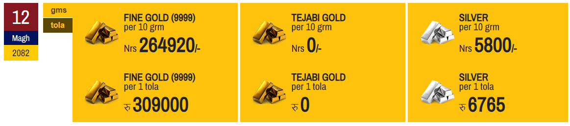 According to the Federation of Nepal Gold and Silver Dealers' Association, the price of fine gold has been set at Rs 309,000 per tola today.