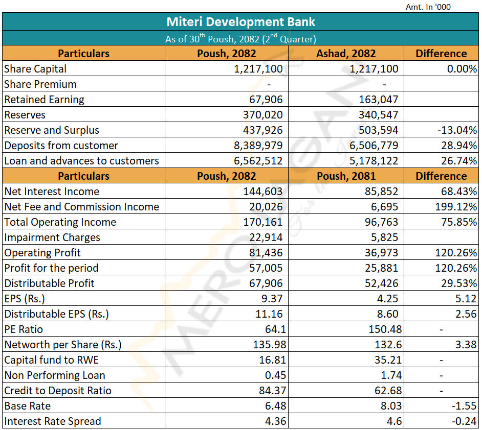 The bank earned net profit of Rs 57 million during the period. The net profit increased by 120.26 percent compared to Rs 25.8 million of the corresponding period of the last FY.
