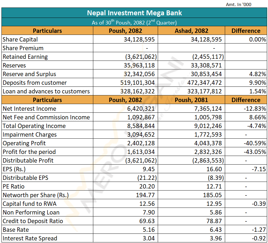 During the period, its net interest income decreased by 12.83 percent and net fee and commission income by 8.66 percent. Similarly, its total operating income decreased by 4.74 percent and operating profit by 40.59 percent. Meanwhile, its impairment charges increased by 3.09 billion from Rs 1.77 billion.