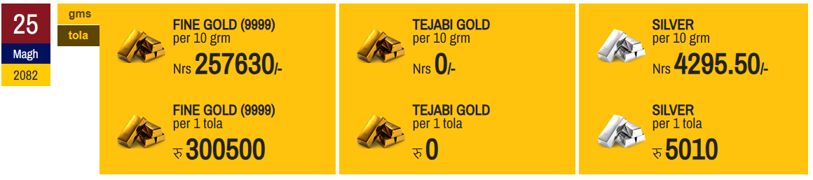 According to the Federation of Nepal Gold and Silver Dealers' Association, the price of fine gold has been set at Rs 300,500 per tola today.