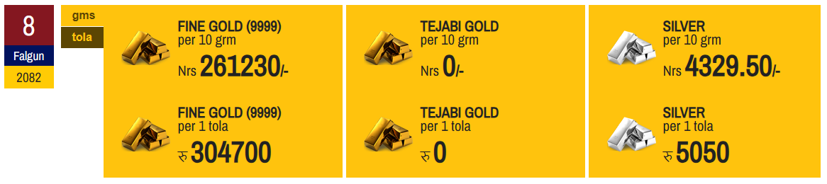 According to the Federation of Nepal Gold and Silver Dealers' Association, the price of fine gold has been set at Rs 304,700 per tola today.
