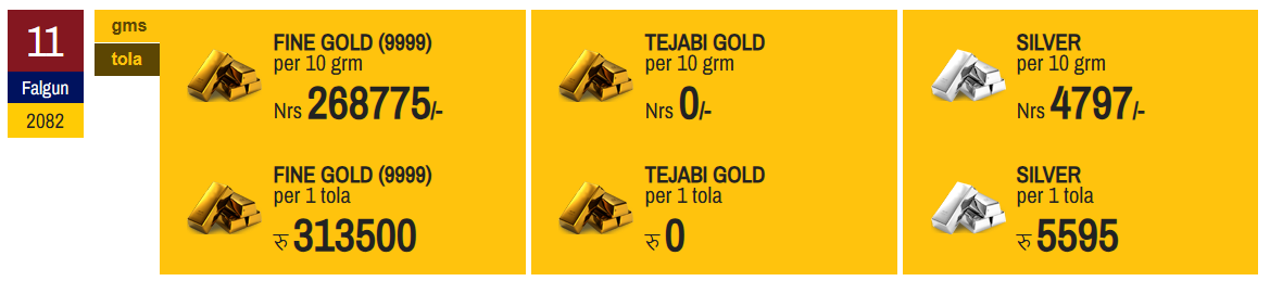 According to the Federation of Nepal Gold and Silver Dealers' Association, the price of fine gold has been set at Rs 313,500 per tola today.