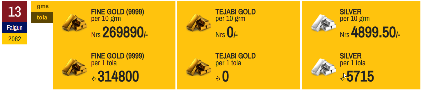 According to the Federation of Nepal Gold and Silver Dealers' Association, the price of fine gold has been set at Rs 314,800 per tola today.