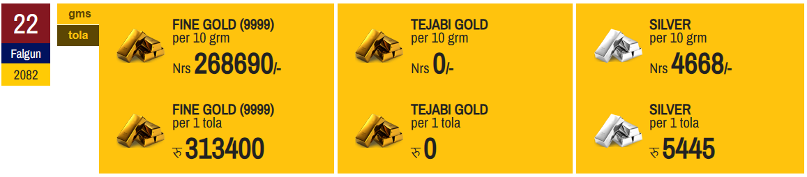According to the Federation of Nepal Gold and Silver Dealers' Association, the price of fine gold has been set at Rs 313,400 per tola today.