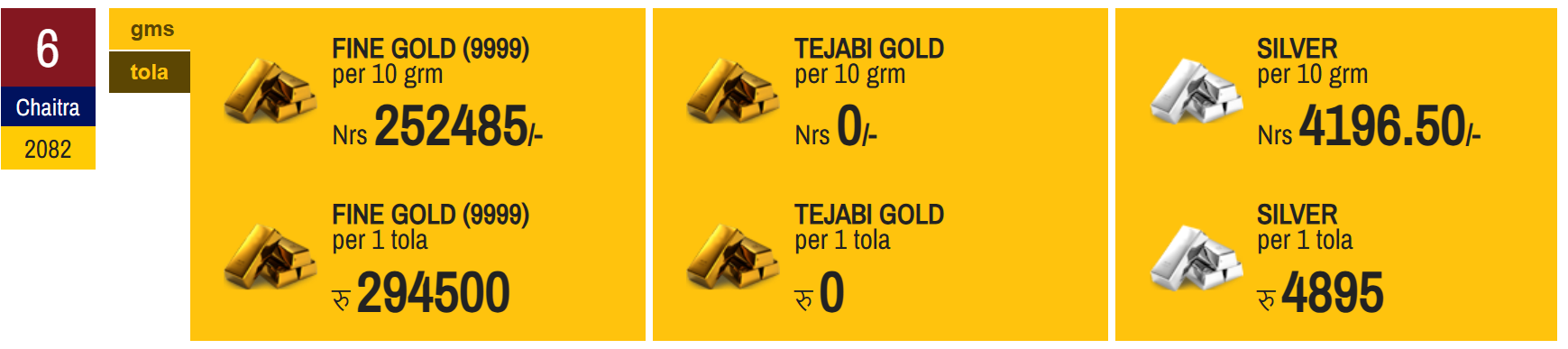 According to the Federation of Nepal Gold and Silver Dealers' Association, the price of fine gold has been set at Rs 294,500 per tola today.