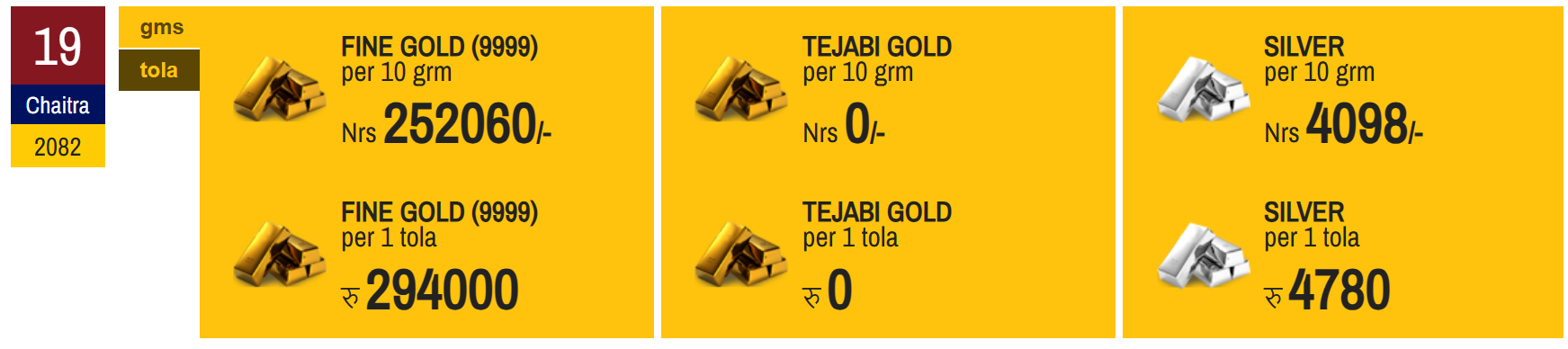 According to the Federation of Nepal Gold and Silver Dealers' Association, the price of fine gold has been set at Rs 294,000 per tola today.
