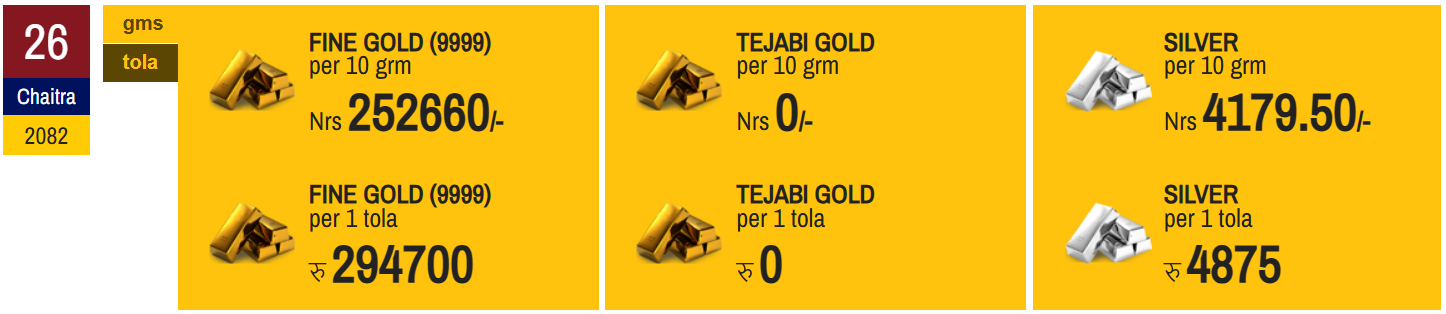 According to the Federation of Nepal Gold and Silver Dealers' Association, the price of fine gold has been set at Rs 294,700 per tola today.