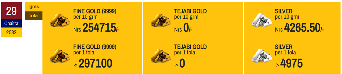 According to the Federation of Nepal Gold and Silver Dealers' Association, the price of fine gold has been set at Rs 297,100 per tola today.