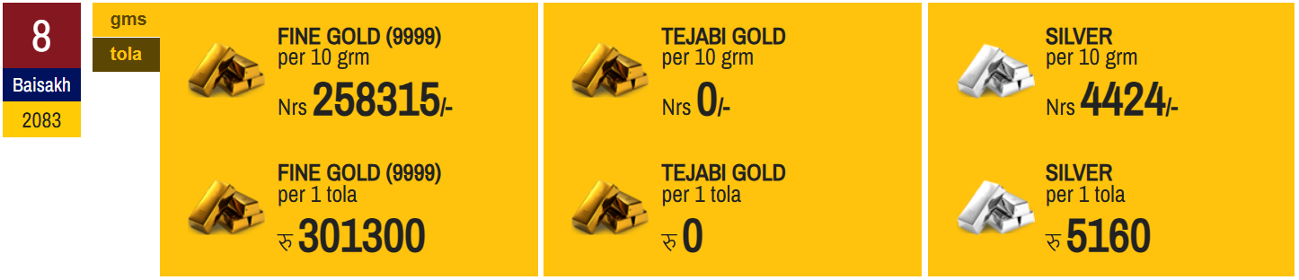 According to the Federation of Nepal Gold and Silver Dealers' Association, the price of fine gold has been set at Rs 301,300 per tola today.