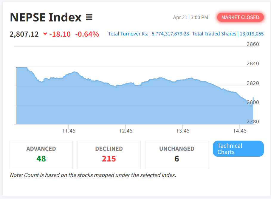 Although the NEPSE index declined, the turnover volume increased marginally on this day. Today, 13,019,055 shares of 347 stocks worth Rs 5.77 billion were traded in 95,800 trades.