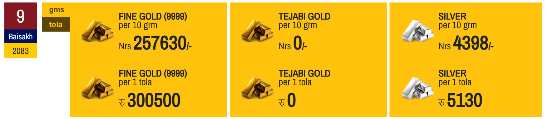 According to the Federation of Nepal Gold and Silver Dealers' Association, the price of fine gold has been set at Rs 300,500 per tola today.