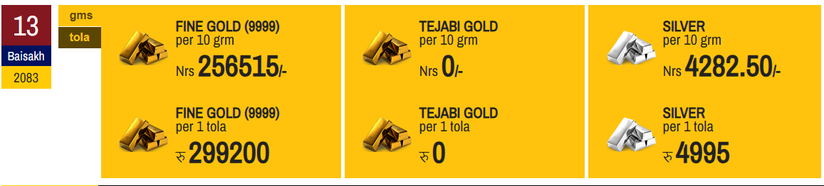 According to the Federation of Nepal Gold and Silver Dealers' Association, the price of fine gold has been set at Rs 299,200 per tola today.