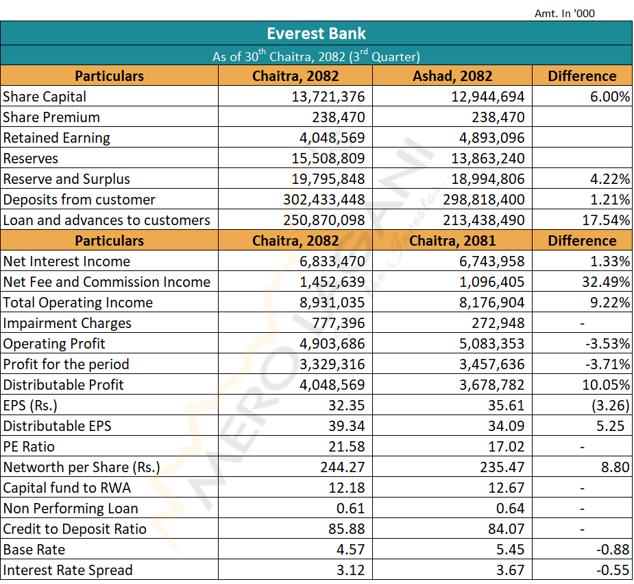 The bank with Rs 13.72 billion in paid-up capital has reserve fund of Rs 19.79 million. The bank collected deposit of Rs 302 billion and extended loans of Rs 250 billion.