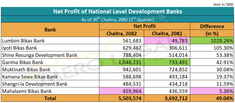 The data shows that Jyoti Bikas Bank's profit has doubled (105.30 percent) while Shine Resunga's profit has increased by 53.38 percent. Meanwhile, Mahalaxmi Bikas Bank's net profit has increased by 5.365 percent.