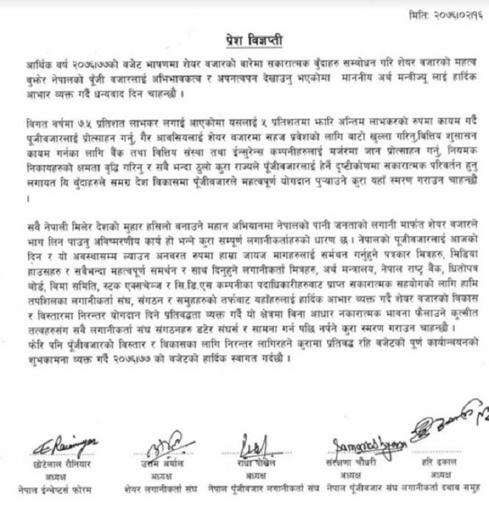 Issuing a joint press statement, all five forums of stock investors have said that the budget has encouraged them by cutting down capital gain tax to 5 percent from earlier 7.5 percent.