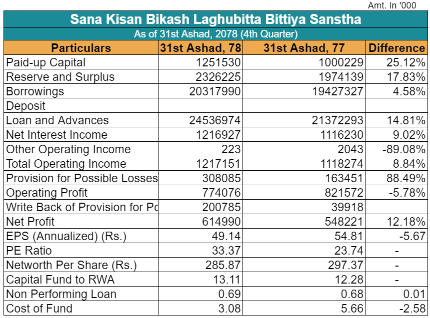Its paid-up capital increased by 25.12 percent and reserve fund increased by 17.83 percent. The company increased its borrowing by 4.58 percent and loan extensions by 14.81 times.