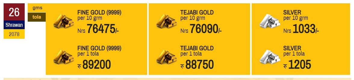 According to the Federation of Nepal Gold and Silver Dealers Association, the price of fine gold is Rs 89,200 and tejabi gold is Rs 88,750 per tola on the day.