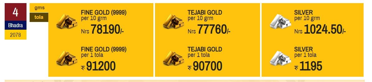 According to the Federation of Nepal Gold and Silver Dealers Association, the price of fine gold is Rs 91,200 and tejabi gold is Rs 90,700 per tola on the day.