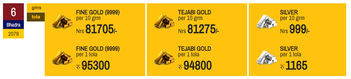 According to the Federation of Nepal Gold and Silver Dealers Association, the price of fine gold is Rs 95,300 and tejabi gold is Rs 94,800 per tola on the day.