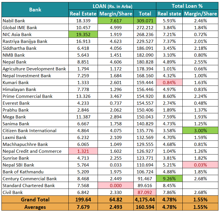 In real estate, Century Commercial Bank has extended the highest lending of Rs 199 billion which is 4.78 percent of the total loan extension of the banks.