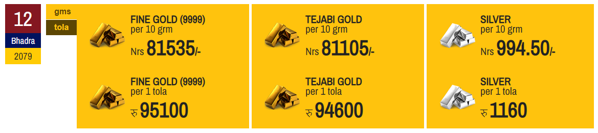 According to the Federation of Nepal Gold and Silver Dealers Association, the price of fine gold is Rs 95,100 and tejabi gold is Rs 94,600 per tola on the day.