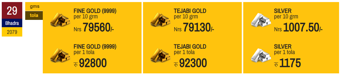 According to the Federation of Nepal Gold and Silver Dealers Association, the price of fine gold is Rs 92,800 and tejabi gold is Rs 92,300 per tola on the day.