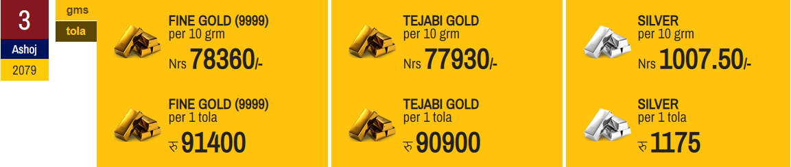 According to the Federation of Nepal Gold and Silver Dealers Association, the price of fine gold is Rs 91,400 and tejabi gold is Rs 90,900 per tola on the day.