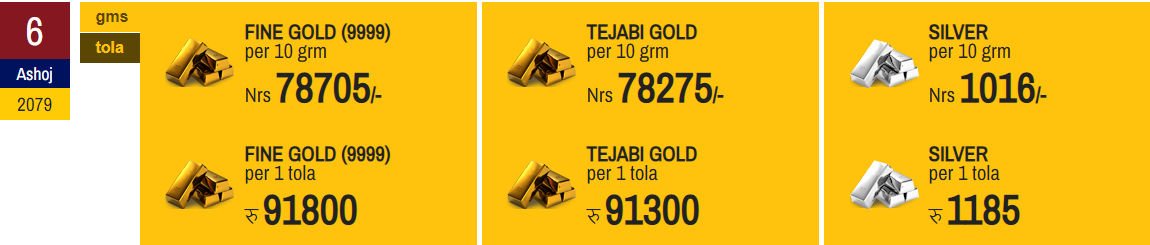According to the Federation of Nepal Gold and Silver Dealers Association, the price of fine gold is Rs 91,800 and tejabi gold is Rs 91,300 per tola on the day.