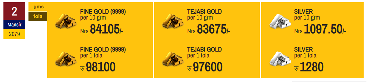 According to the Federation of Nepal Gold and Silver Dealers Association, the price of fine gold is Rs 98,100 and tejabi gold is Rs 97,600 per tola on the day.