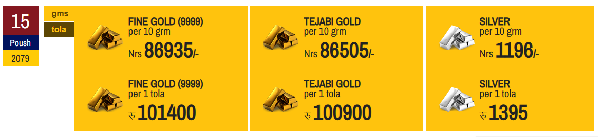 According to the Federation of Nepal Gold and Silver Dealers Association, the price of fine gold is Rs 101,400 and tejabi gold is Rs 100,900 per tola on the day.